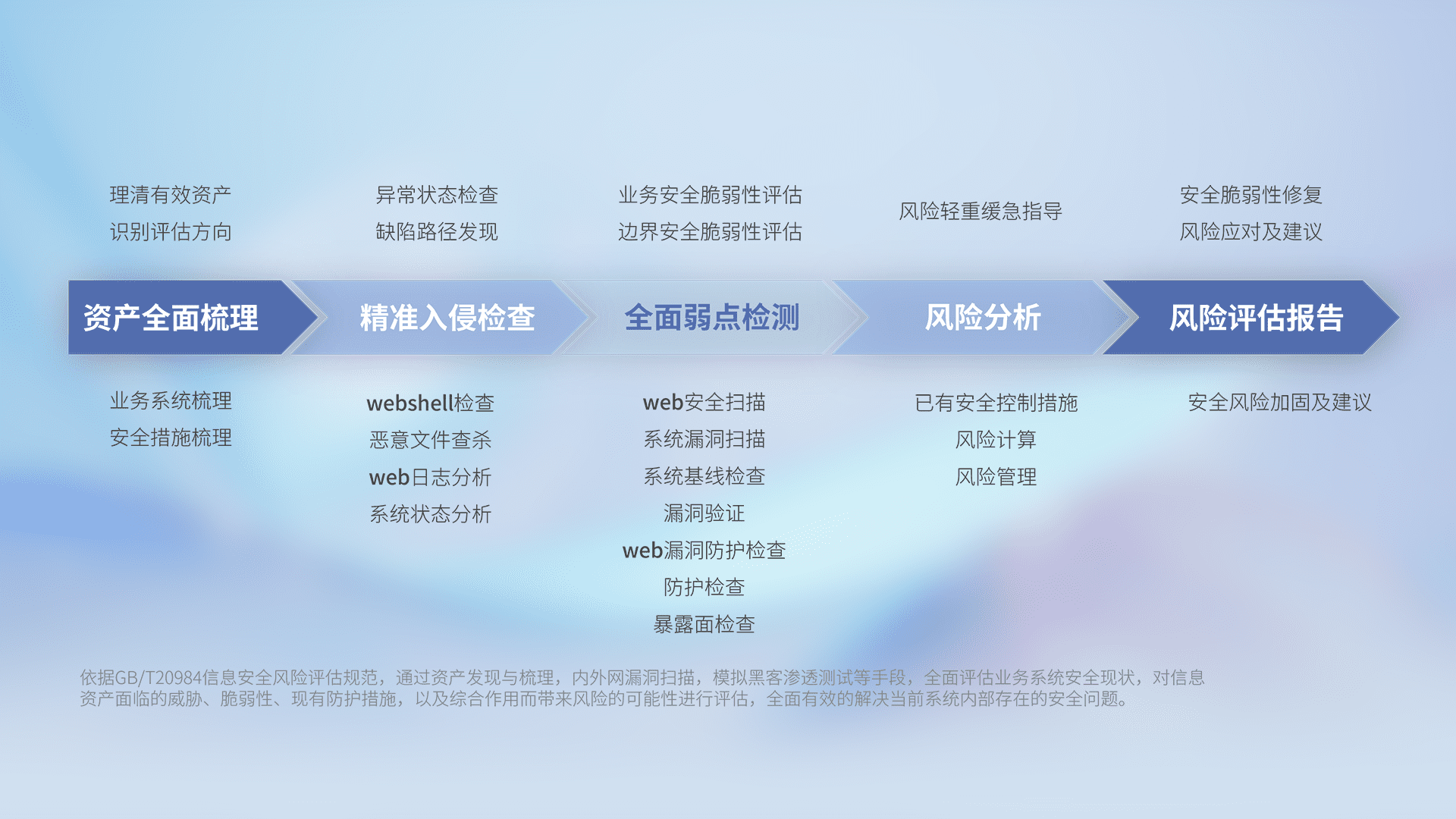 针对客户行业特性,,,,以专业的安全服务+多厂商联合解决方案提供专属的一站式安全管理服务,,,帮助客户全面感知网络空间威胁,,,基于识别、、、、检测、、分析、、、、防护、、、监测、、、、响应的服务理论模型,,从方案咨询、、、、集成交付、、评估验证、、优化加固、、、、运维运营,,,致力于为客户提供完整的闭环管理式安全服务。。。以实战经验为客户打造高抵御风险的安全体系,,帮助客户发现威胁、、对抗威胁、、处置威胁,,,,不断积累安全对抗能力,,持续保障数字化安全。。